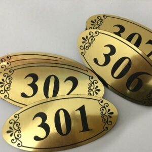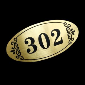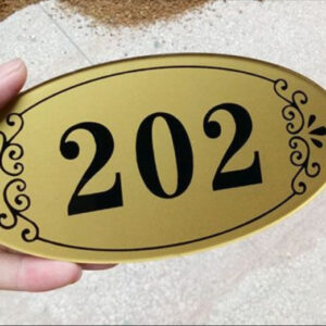 Biển số phòng khách sạn nhựa mica trong ảnh có thiết kế hình bầu dục với màu vàng đồng sang trọng. Trên biển có số in đậm màu đen ở giữa, tạo sự tương phản rõ rệt và dễ dàng nhận diện. Hai bên số có các họa tiết trang trí đối xứng màu đen, mang lại vẻ đẹp cổ điển và tinh tế. Chất liệu nhựa mica bền bỉ, chống trầy xước và dễ dàng vệ sinh, giúp biển số luôn giữ được vẻ đẹp ban đầu.