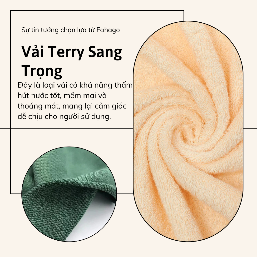- Chất liệu: Vải terry, hay còn gọi là vải bông, được làm từ sợi cotton hoặc sợi tổng hợp. Đây là loại vải có khả năng thấm hút nước tốt, mềm mại và thoáng mát, mang lại cảm giác dễ chịu cho người sử dụng. Vải terry thường có cấu trúc dạng vòng, tạo ra bề mặt xốp và mềm, giúp giữ ấm cơ thể sau khi tắm.