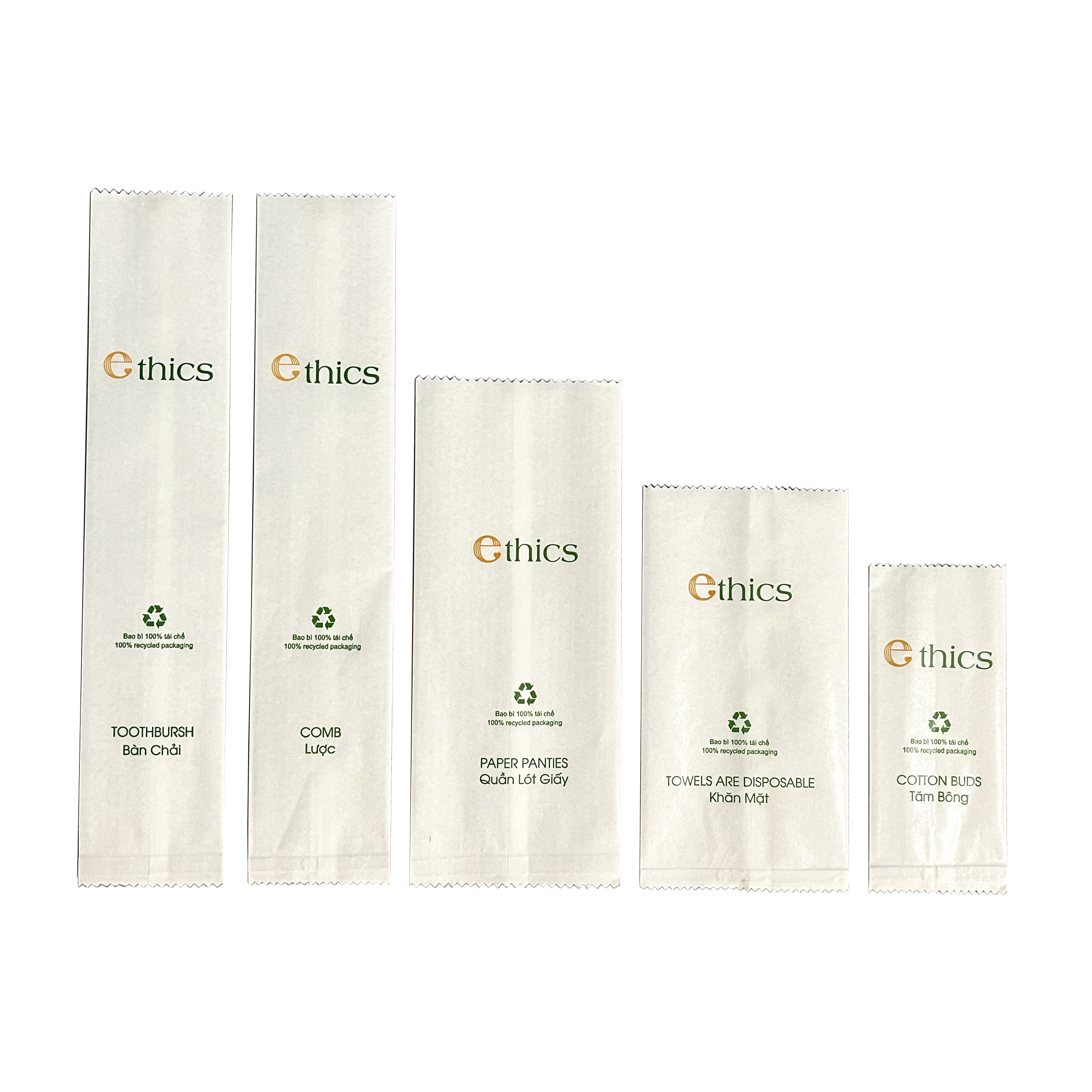 Thiết kế gọn gàng và tiện lợi của bộ túi giấy trắng in 2 màu giúp khách hàng dễ dàng sử dụng và mang theo. Sản phẩm phù hợp để chứa đựng các vật dụng tiêu hao hàng ngày như bàn chải, lược, dao cạo râu, chụp tóc và tăm bông. Những túi nhỏ gọn này có thể được sắp xếp trong phòng tắm hoặc trong túi xách cá nhân, tiết kiệm không gian và mang lại sự tiện lợi cho khách hàng.