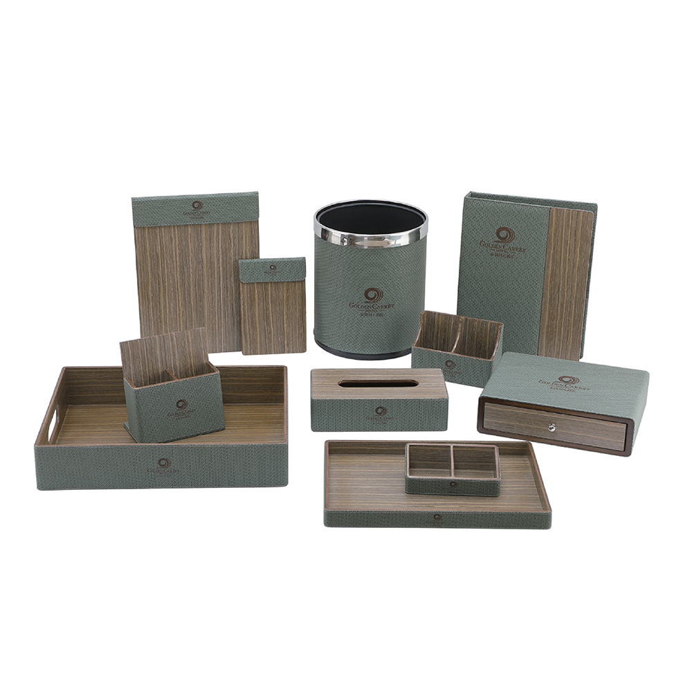 Bộ đồ da dành cho khách sạn gồm các vật dụng màu xanh lá cây với họa tiết vân gỗ, in logo . Bộ đồ bao gồm thùng rác, khay đựng giấy, hộp đựng khăn giấy, khay và hộp đựng đồ.