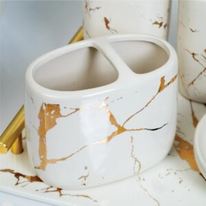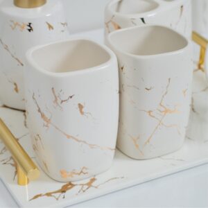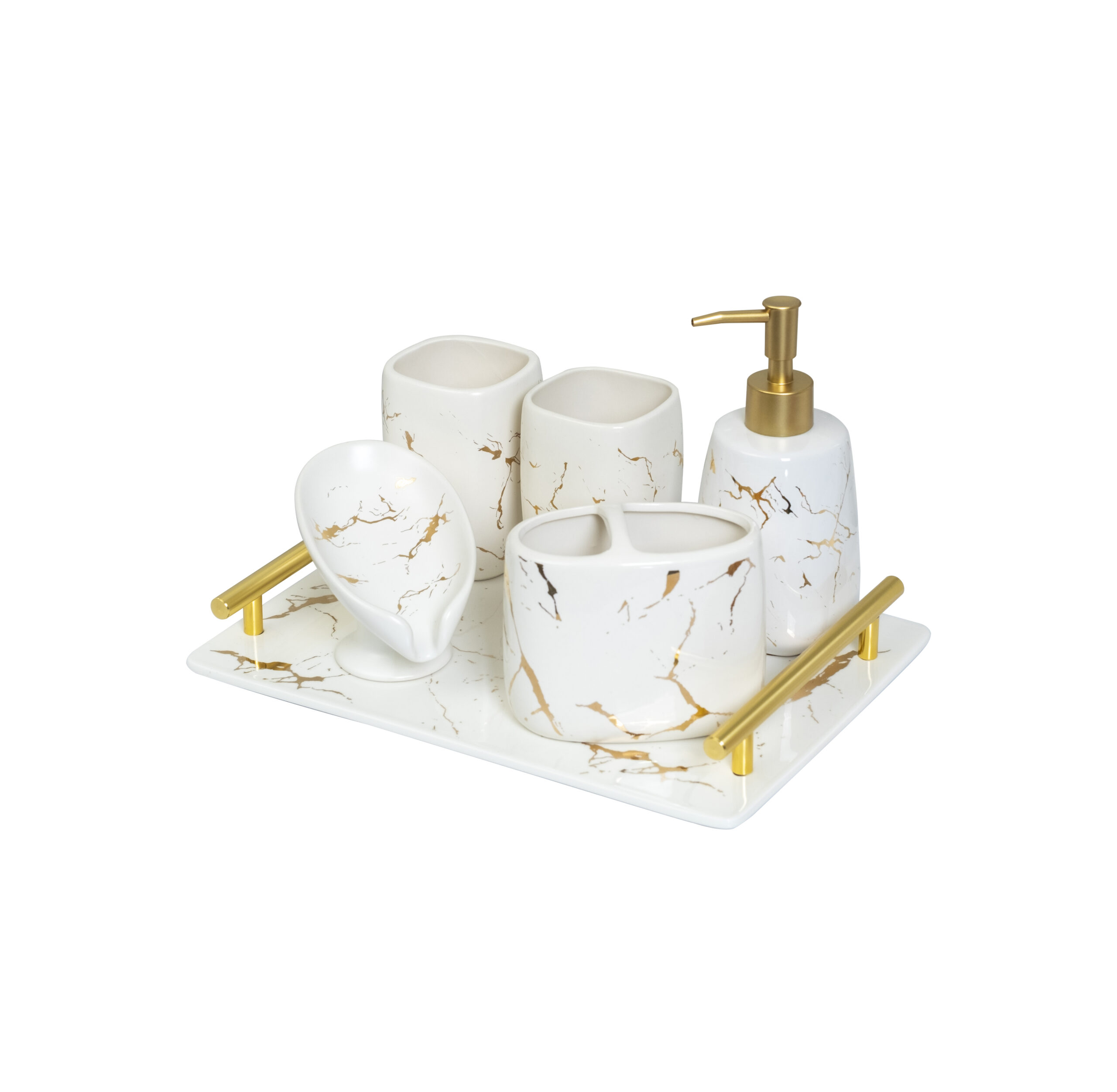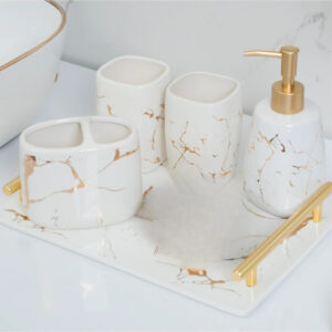 Bộ đồ sứ khách sạn LUX-2 được thiết kế với các hoa văn vân đá tự nhiên, mang lại vẻ đẹp thanh lịch và độc đáo cho không gian phòng tắm. Màu sắc chủ đạo là màu trắng kết hợp với các đường vân vàng nổi bật, tạo nên sự hài hòa và tinh tế. Khay có tay cầm mạ vàng giúp dễ dàng di chuyển và tăng thêm vẻ đẹp quý phái cho sản phẩm.
