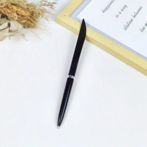 Một chiếc bút bi độc đáo, với thiết kế thân bút tựa như một cán dao sang trọng. Chiếc bút có màu đen bóng, nổi bật với một vòng kim loại màu bạc tinh tế ở giữa. Với kiểu dáng lịch lãm và ấn tượng, chiếc bút này có thể là một điểm nhấn đặc biệt trong các khách sạn hoặc nhà hàng cao cấp, tạo nên một dấu ấn khó quên cho khách hàng khi sử dụng.