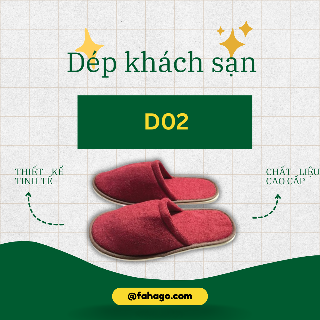 - Tạo dấu ấn tốt đẹp: Dép vải terri kín mũi dùng 1 lần khách sạn D02 không chỉ là một sản phẩm thông thường mà còn là biểu tượng của sự quan tâm và chăm sóc đặc biệt từ phía khách sạn. Sự hài lòng của khách hàng sẽ giúp nâng cao uy tín và chất lượng dịch vụ của khách sạn, tạo ra những ấn tượng tốt đẹp ngay từ lần sử dụng đầu tiên.