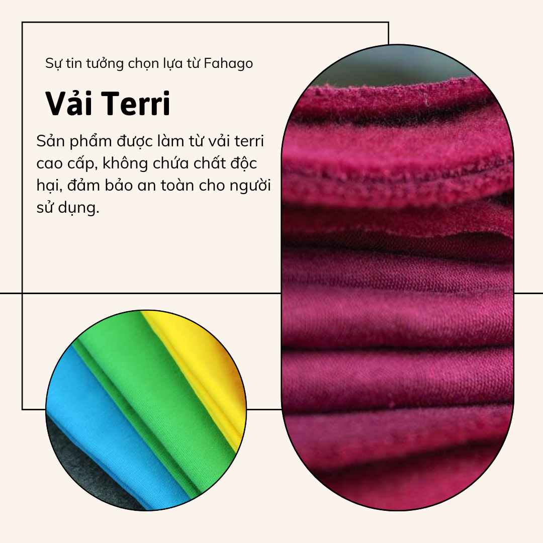 - Thân thiện với môi trường: Chất liệu từ vải terri tự nhiên và bao bì thân thiện với môi trường, giúp giảm thiểu tác động tiêu cực đến môi trường.