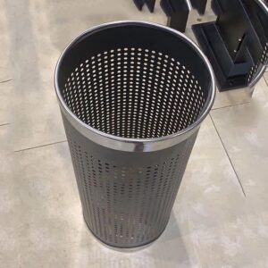 Cả hai đều có thiết kế hình trụ với các lỗ nhỏ đều nhau trên bề mặt. Một giá có màu đen với viền kim loại sáng bóng phía trên, còn giá kia hoàn toàn bằng kim loại sáng bóng. Bề mặt của giá được thiết kế với các lỗ nhỏ đều nhau, giúp thoát nước từ ô một cách hiệu quả, ngăn ngừa tình trạng ẩm mốc và giữ cho sàn nhà luôn khô ráo. Với thiết kế đơn giản nhưng tinh tế, các giá để ô này không chỉ giữ ô gọn gàng mà còn là một điểm nhấn thú vị trong không gian khách sạn