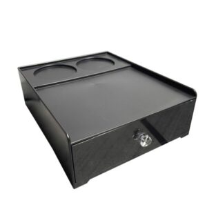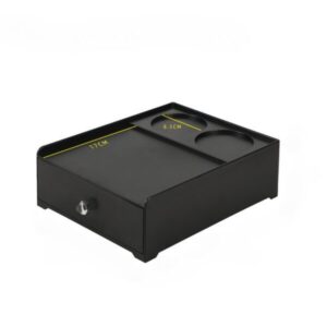 Khay có hai chỗ tròn để úp cốc và một ngăn kéo phía dưới để đựng các vật dụng nhỏ. Thiết kế đơn giản và tiện lợi, phù hợp cho việc sử dụng trong các phòng khách sạn để giữ gọn gàng các vật dụng cá nhân của khách.