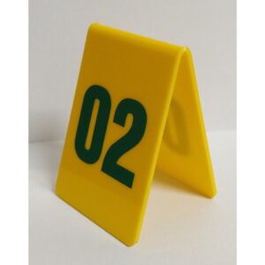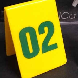 Thẻ số để bàn TDB-1 được làm từ chất liệu nhựa mica bền bỉ, có khả năng chống trầy xước và dễ dàng vệ sinh. Thiết kế của thẻ là hình chữ nhật màu vàng với số in màu xanh lá cây nổi bật. Thẻ số này có kích thước vừa phải, dễ dàng nhìn thấy và đọc được từ xa, giúp khách hàng và nhân viên không gặp khó khăn trong việc nhận diện.