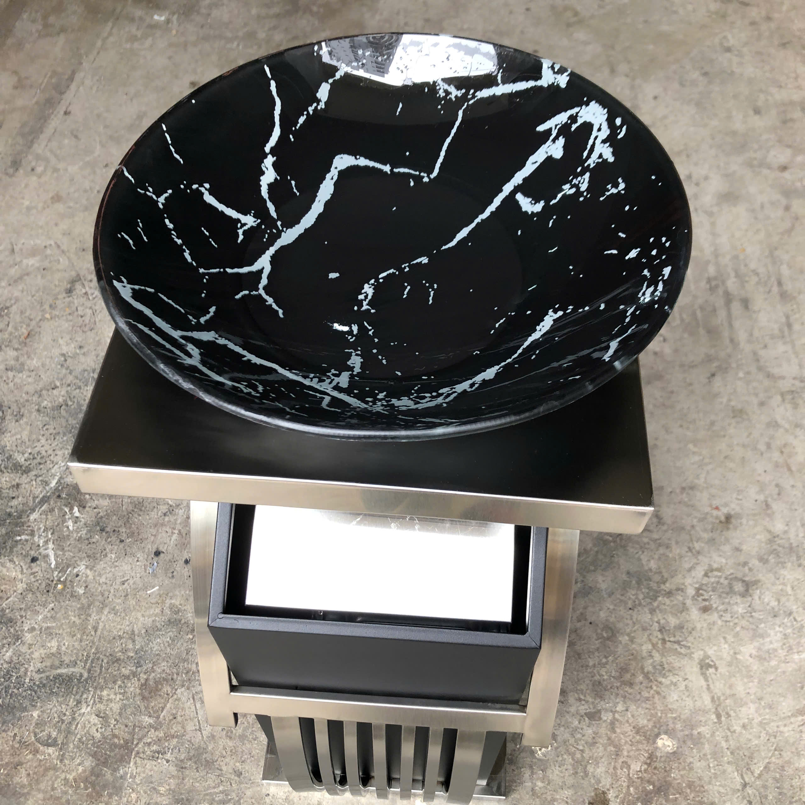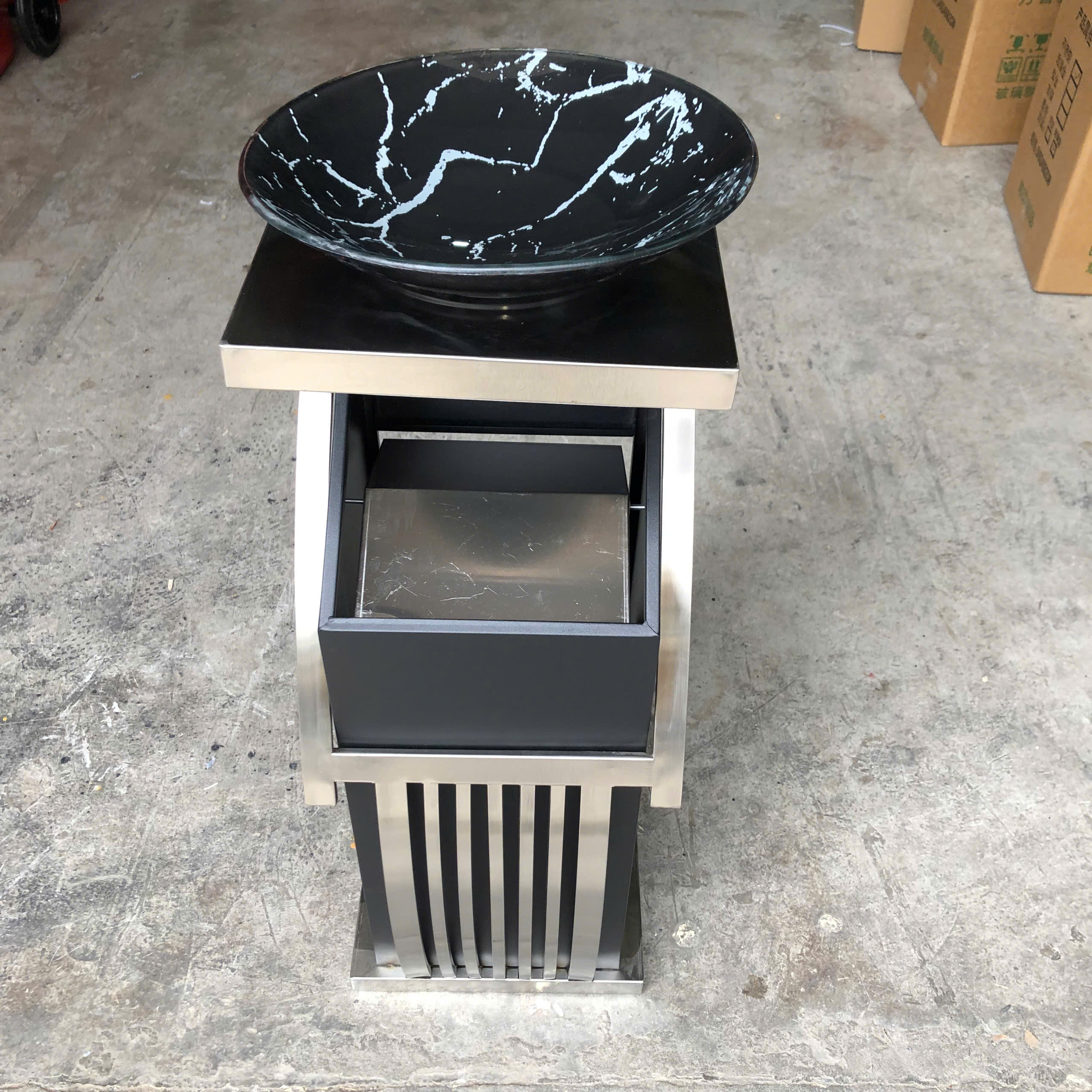 Gạt tàn thủy tinh trong suốt được đặt phía trên thùng rác, vừa tiện lợi cho người sử dụng vừa giúp giữ sạch không gian xung quanh. Sự kết hợp này phù hợp với những khu vực có lượng người hút thuốc lớn.
