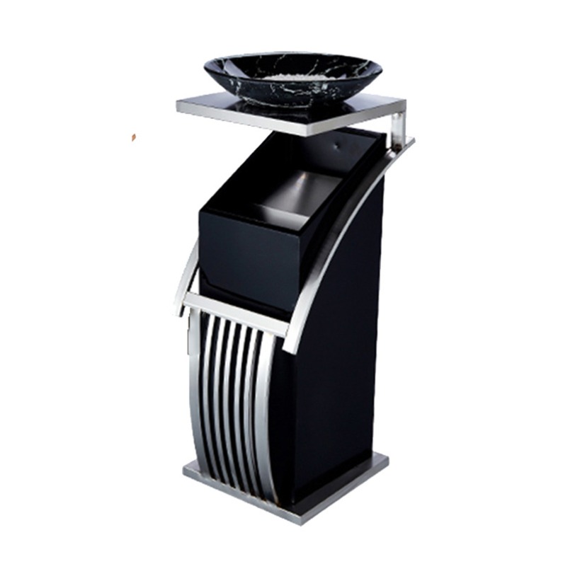 Gạt tàn thủy tinh trong suốt được đặt phía trên thùng rác, vừa tiện lợi cho người sử dụng vừa giúp giữ sạch không gian xung quanh. Sự kết hợp này phù hợp với những khu vực có lượng người hút thuốc lớn.