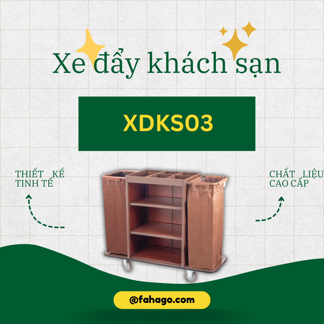 Xe đẩy buồng phòng khách sạn mã XD03 có hai túi vải màu nâu ở hai bên. Phần giữa của xe đẩy có ba kệ gỗ để chứa đồ và một ngăn trên cùng có nhiều ô nhỏ để phân loại các vật dụng. Xe đẩy được trang bị bốn bánh xe để dễ dàng di chuyển.