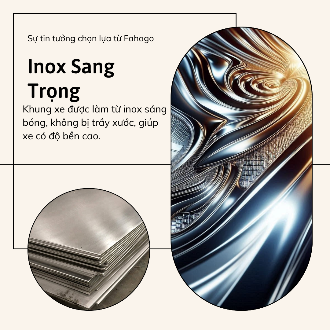 - Chất liệu: Khung xe được làm từ inox sáng bóng, không bị trầy xước, giúp xe có độ bền cao và đảm bảo vệ sinh trong quá trình sử dụng. Chất liệu inox cũng giúp xe chống ăn mòn và dễ dàng lau chùi.