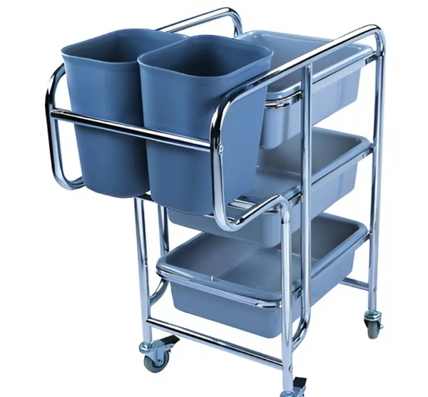 - Thiết kế: Xe đẩy thu gom bát đĩa có kết cấu ba tầng với ba khay đựng rộng rãi và hai thùng chứa đồ dơ. Thiết kế này giúp tối ưu hóa việc thu gom và vận chuyển bát đĩa. Bánh xe xoay linh hoạt, có phanh hãm, giúp di chuyển dễ dàng và an toàn hơn trong mọi không gian.